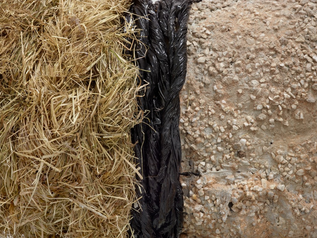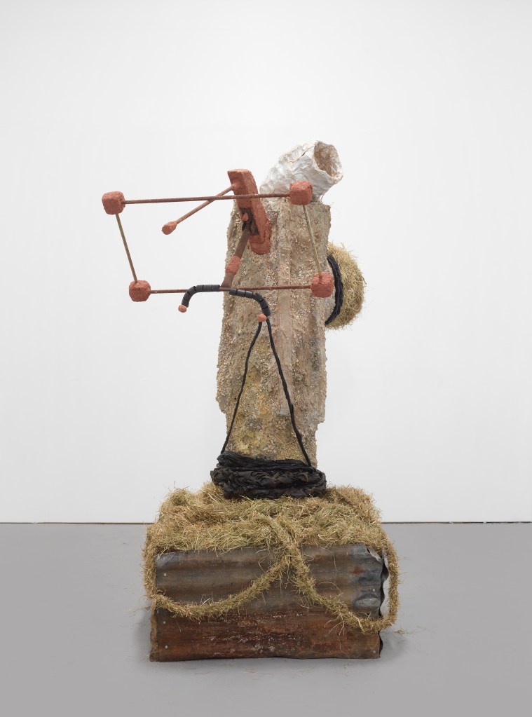 ‘Crop Duster 1’. 2025. 176cm x 107cm x 168cm. Corrugated iron, sand, plaster, pebble dash, paper pulp, iron pigment, found metal, hay, bale tie, tin foil, bitumen rags, pine wood, wire and chicken wire.