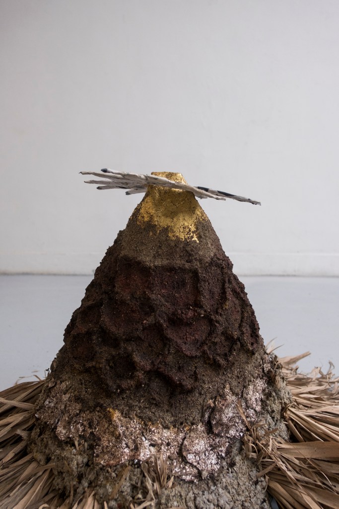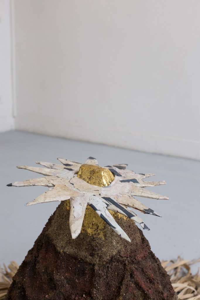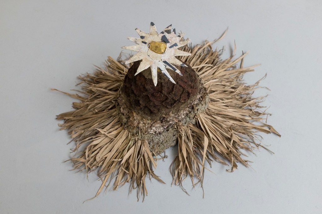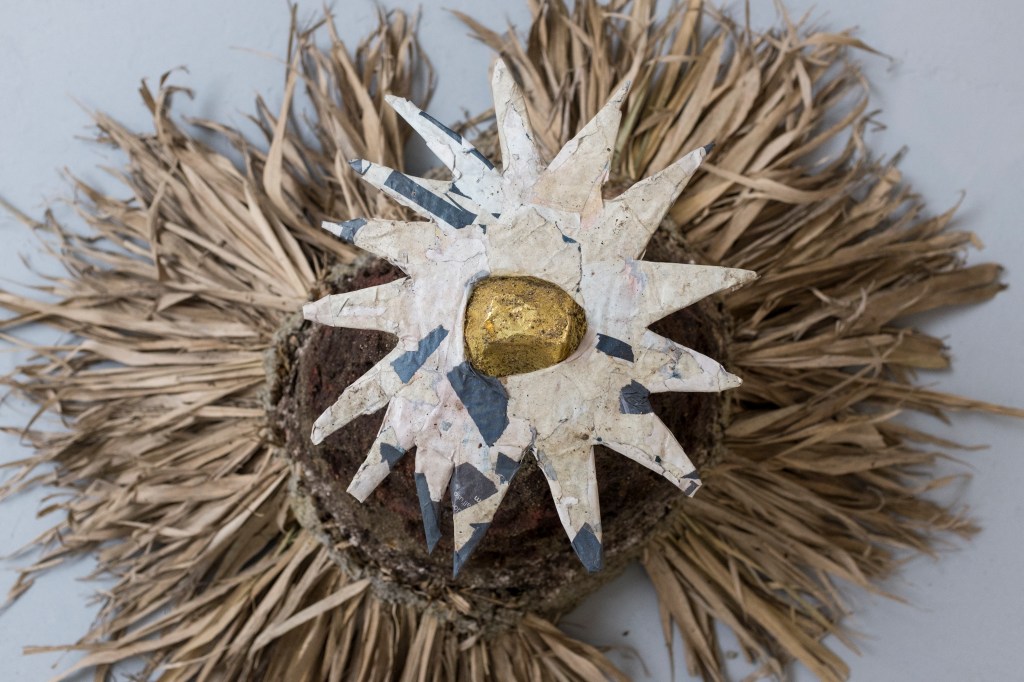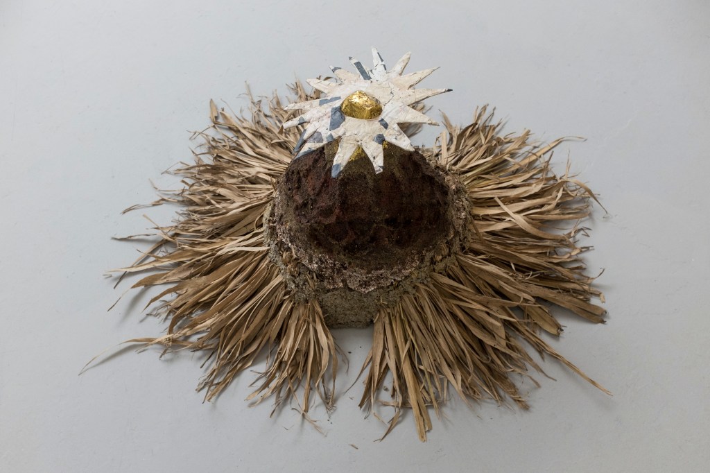 ‘Sun-King’, (2026) bamboo leaves, sand, mud, newspaper, gold leaf, found posters, cardboard, tinfoil, wood & Chicken wire. 120 x 80 x 50cm