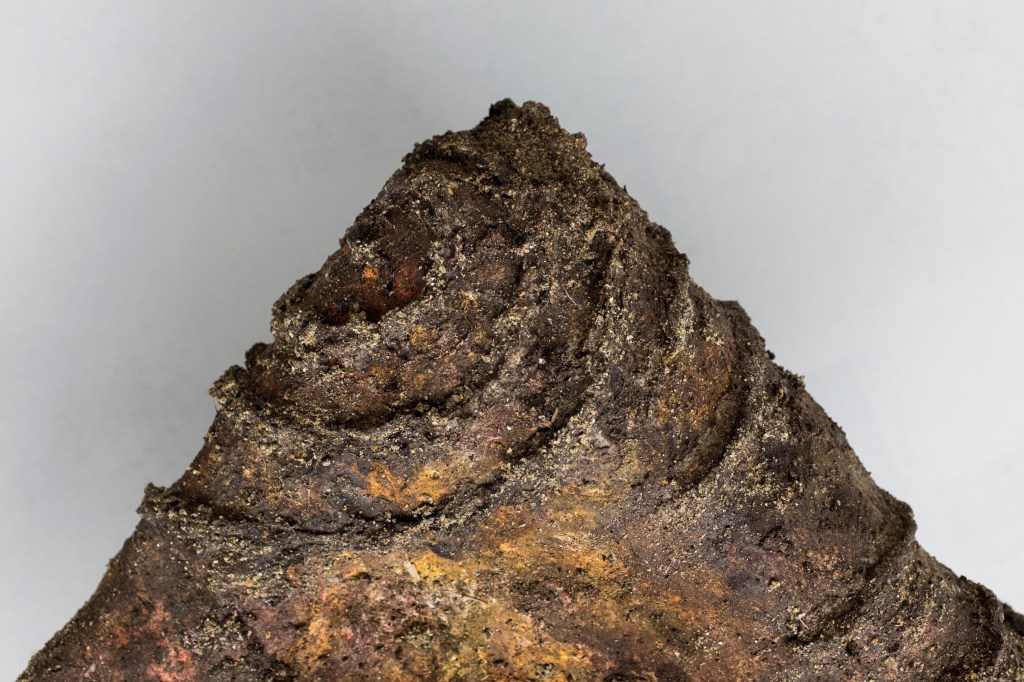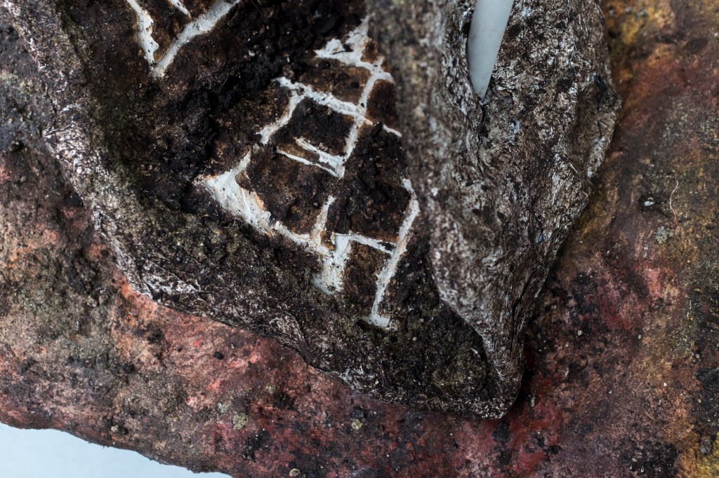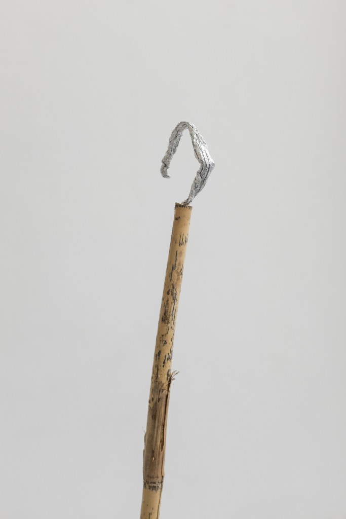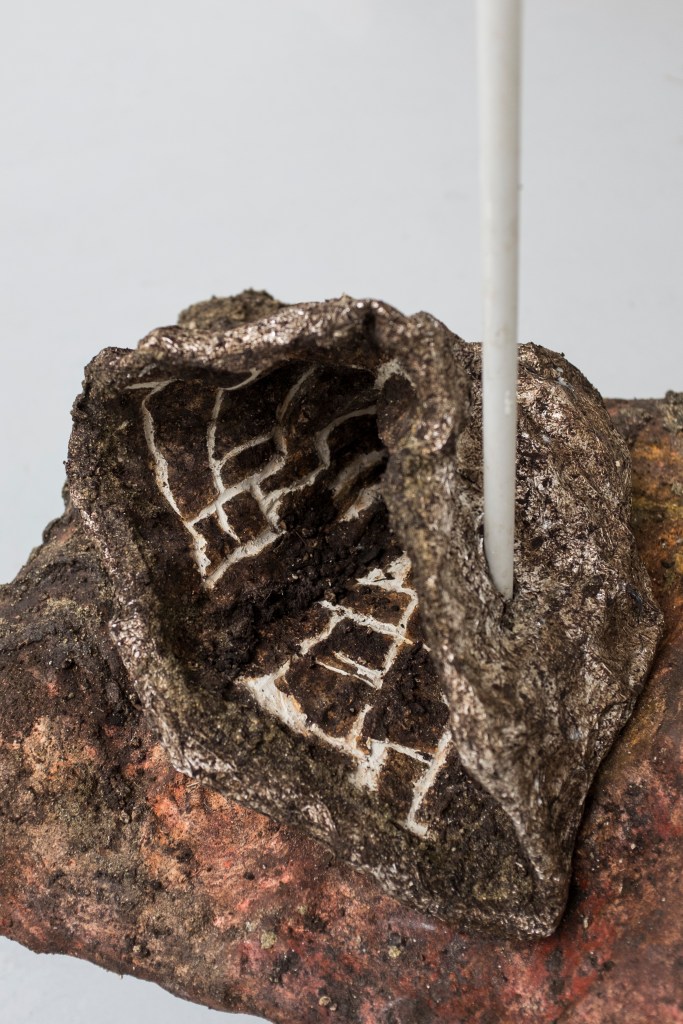 ‘Sampietrini’ (2026), plaster, tin foil, bamboo, soil, pigment, plastic piping, sampietrini, sand, wire, wood. 63 x 54 x 136cm Photo Credit: Luana Rigolli, Courtesy The British School at Rome