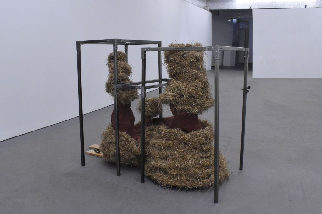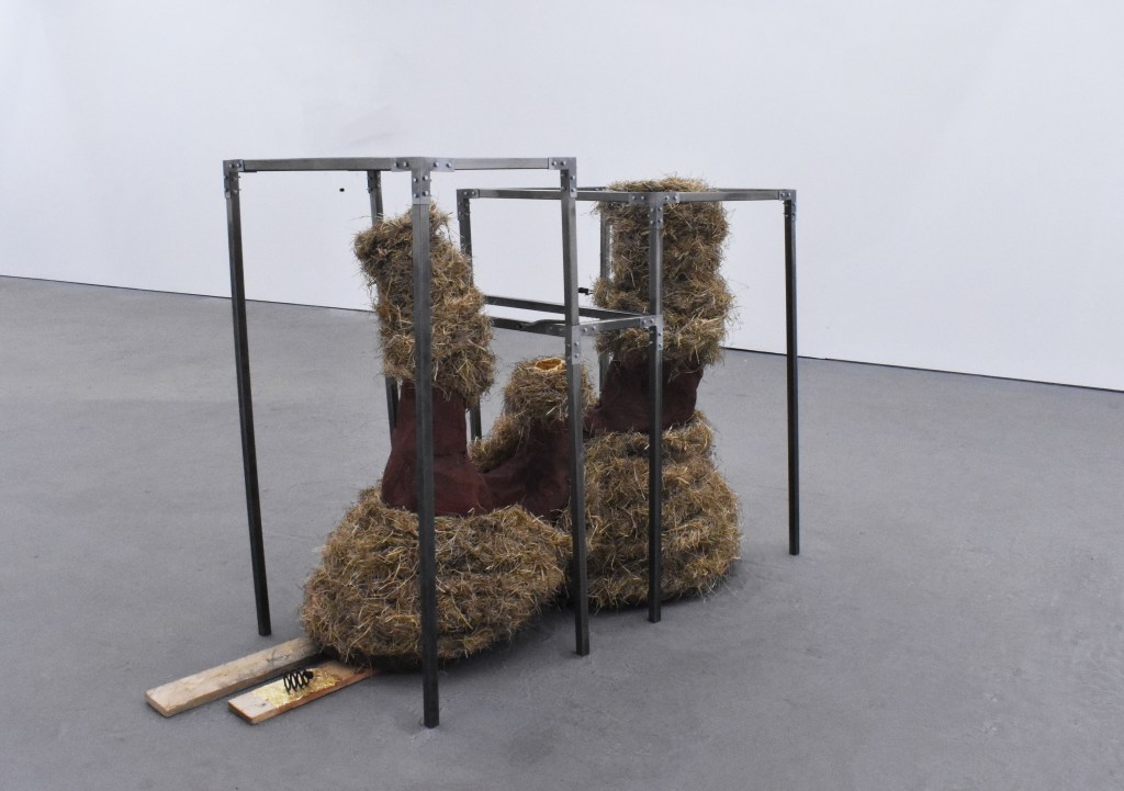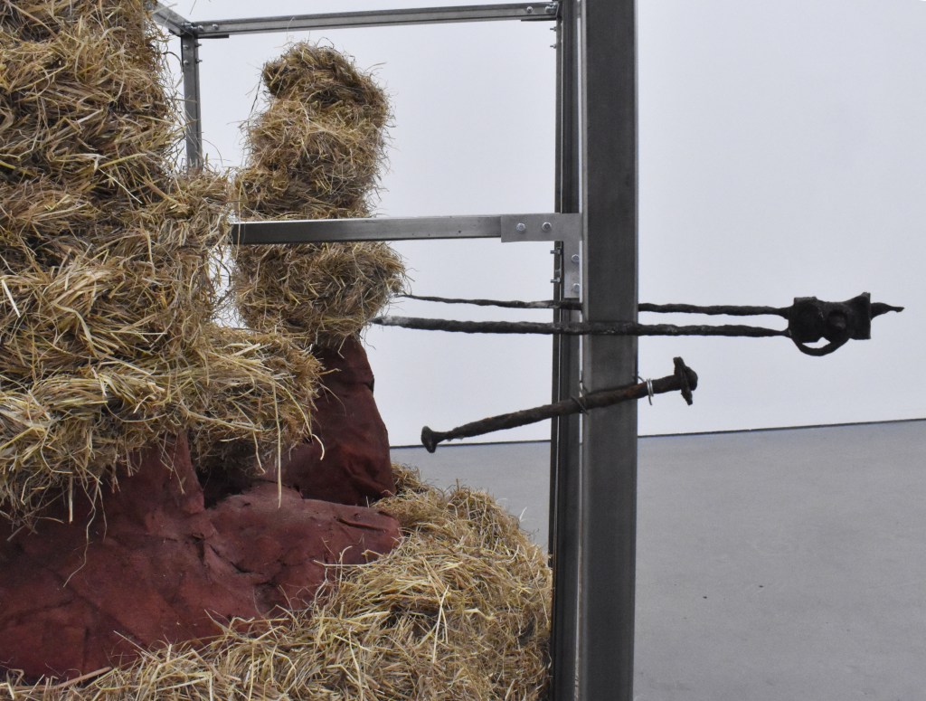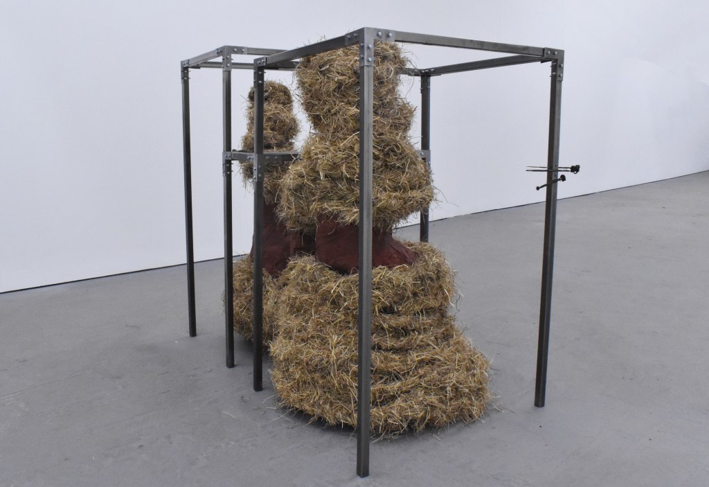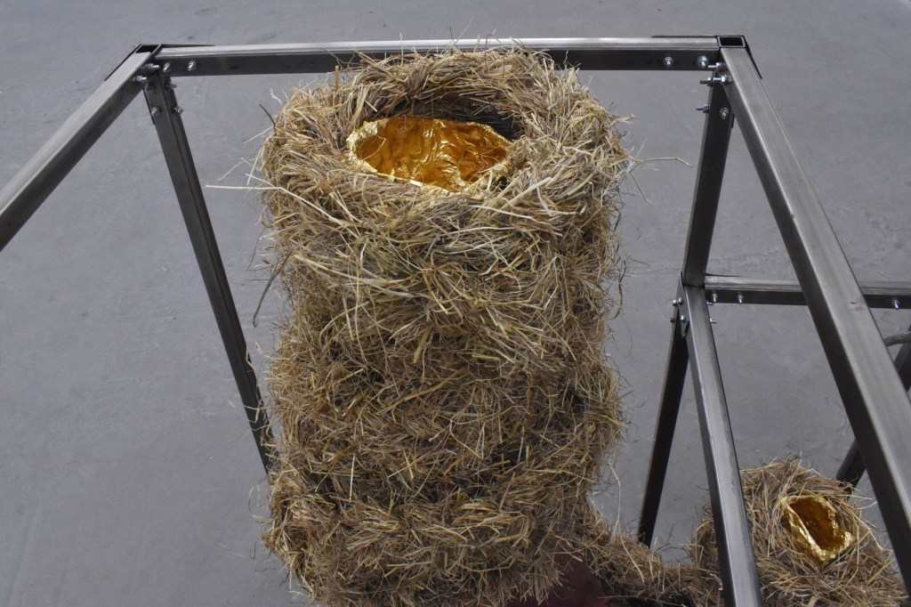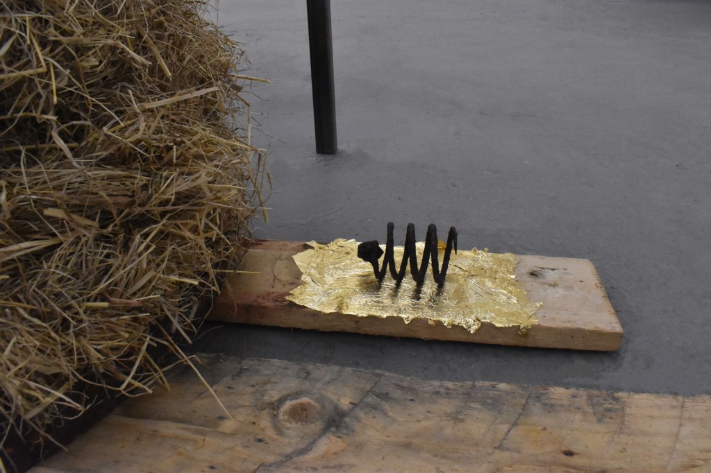 Heart of Gold ‘Heart of gold’. 2024. 70 x 140 x 107cm. Hay, Florence mine iron pigment, calico, gold leaf, steel bar, found wood, wire and found metal.