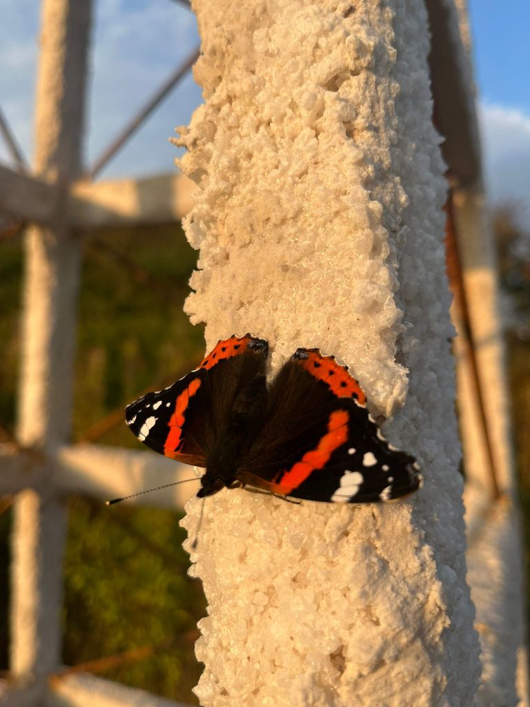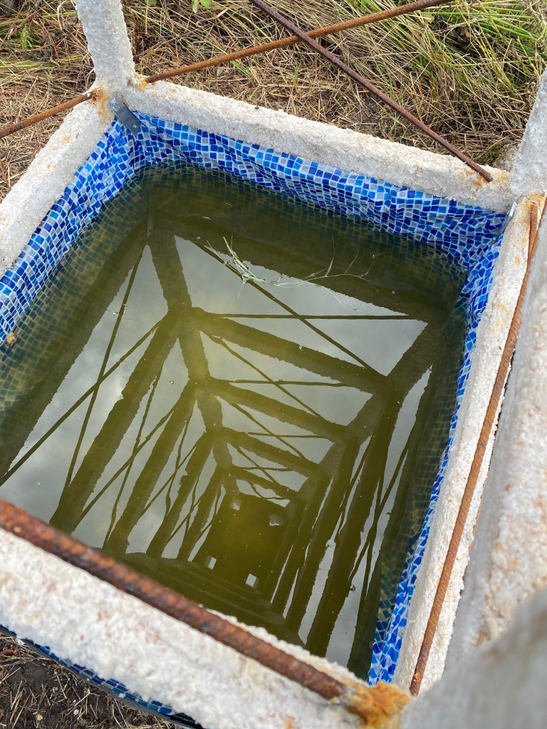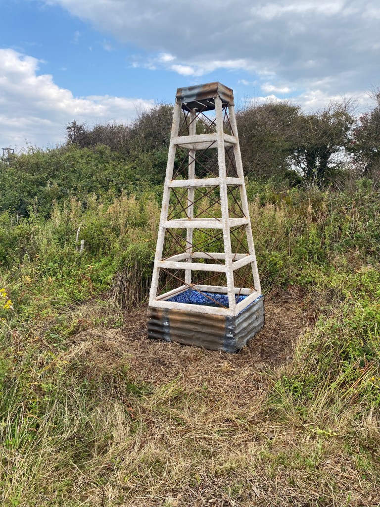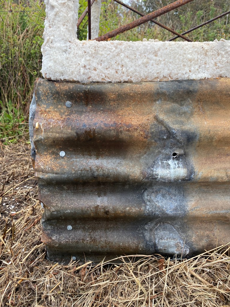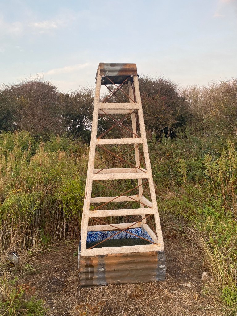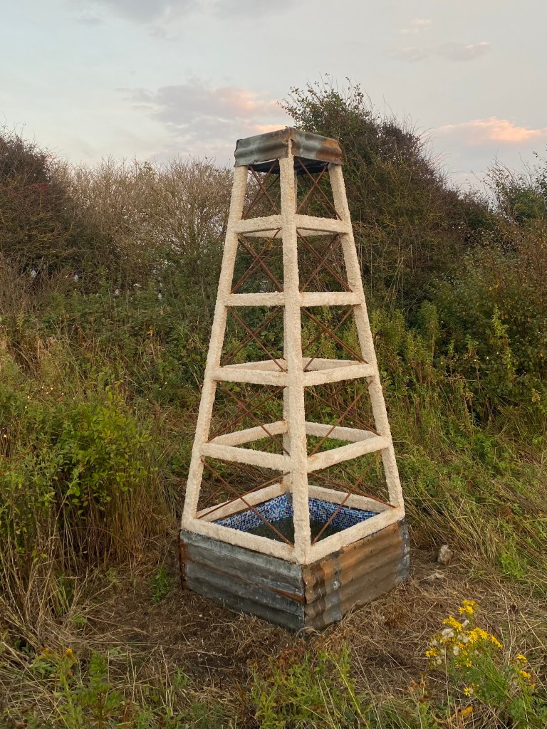 Comb-Brine ‘Comb-brine’, 2024. Salt, Sand, Re-rod, Wood, Shower Curtain, Water, Wood and Corrugated Iron.